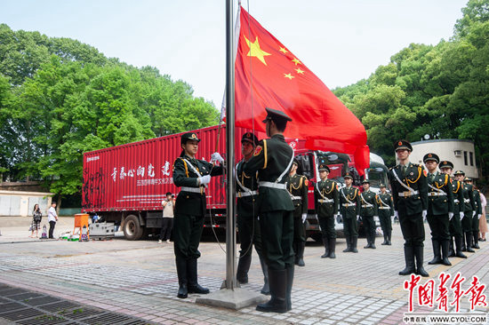 4月25日,武汉大学梅园操场,武汉大学国旗护卫队的同学们正在“时光宝盒”前举行升旗仪式。湖北高校传媒联盟记者 李慕文/摄