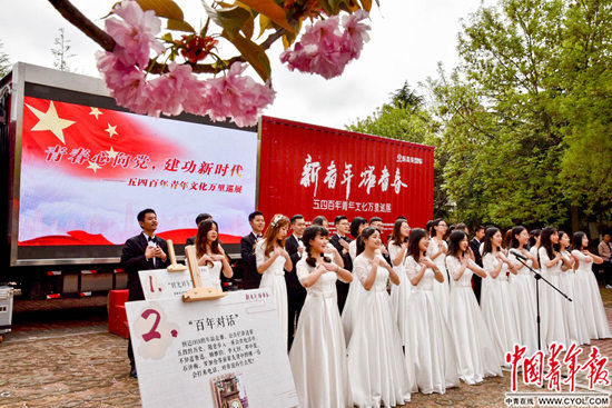 4月18日,“新青年 耀青春”“东风”五四百年青年文化万里巡展湖南师范大学站活动进入第二天。活动现场,来自该校天籁合唱团成员,带领在场数百名师生,唱响青年励志爱国歌曲,同学们在现场互动频繁,引来众多路人围观。中国青年报·中青在线实习生 蒋浩田/摄