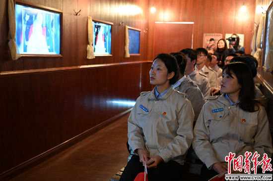 5月1日,山东青岛五四广场,团员青年在“时光宝盒”里参观,体验穿越历史之旅。中国青年报·中青在线记者 李隽辉/摄