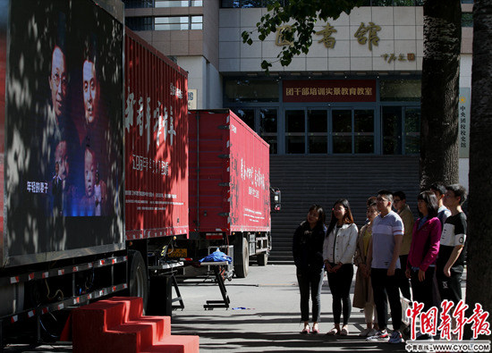 5月5日,中央团校,研究生们在“时光宝盒”的大屏幕前观看在“新青年 耀青春”纪念五四运动100周年文艺晚会上播出的讲述两弹元勋邓稼先的节目《等待》。中国青年报·中青在线记者 陈剑/摄