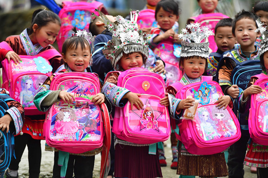 5月30日,融水苗族自治县杆洞乡黔桂乌英苗寨的孩子们领到了爱心书包。当日,广西柳州市交警、消防等部门以及部分爱心企业志愿者来到融水苗族自治县杆洞乡黔桂乌英苗寨,为孩子们传授交通知识和消防技能,并送上“六一”节礼物,迎接儿童节的到来。新华社记者 黄孝邦/摄