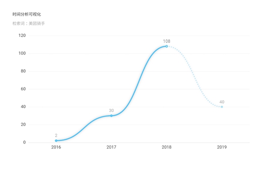 Alpha(阿尔法)法律智能操作系统中,以“美团骑手”为关键词得到的数据图表。2016年到2018年,案件数量逐年上升