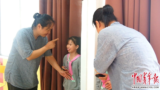 张咏教孩子练习发音。中国青年报·中国青年网记者 谢洋摄