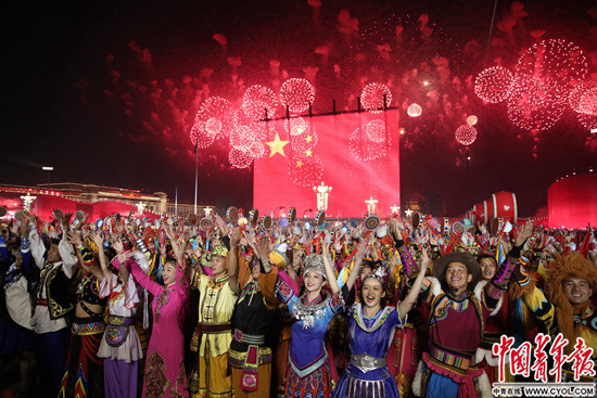 •     10月1日,北京天安门广场,庆祝中华人民共和国成立70周年联欢活动举行,各族青年共同欢呼。中国青年报·中国青年网记者 赵迪/摄
