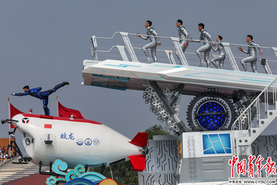 10月1日,庆祝中华人民共和国成立70周年大会上,“创新驱动”方阵彩车经过天安门广场。中国青年报·中国青年网记者 李隽辉/摄