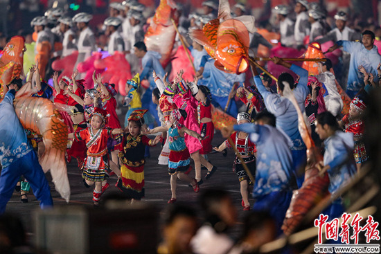 在《好儿好女好家园》的歌声中,群众联欢10个区块和表演台上的群众载歌载舞、同欢同乐。