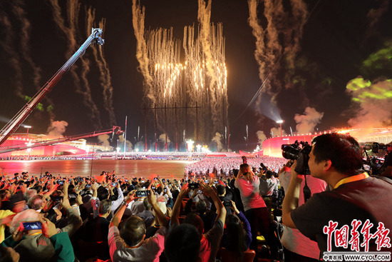 当《歌唱祖国》熟悉的旋律响起,特效烟花“70”华丽升空,一面长90米、高60米的电子国旗升起,联欢活动现场沸腾了,“祖国万岁”的呼声此起彼伏。