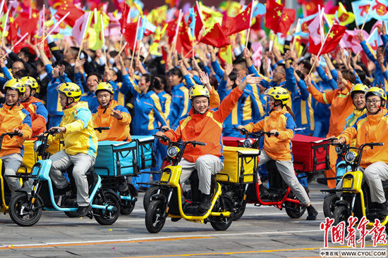 10月1日,庆祝中华人民共和国成立70周年大会上,快递小哥和各界劳动者方阵经过北京天安门广场。中国青年报·中国青年网记者 李隽辉/摄