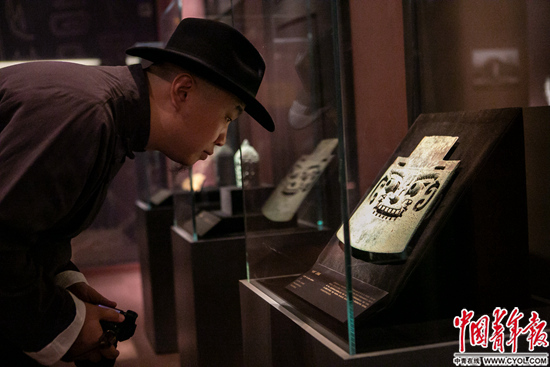 一名观众在观看展品“亚酌”青铜钺。