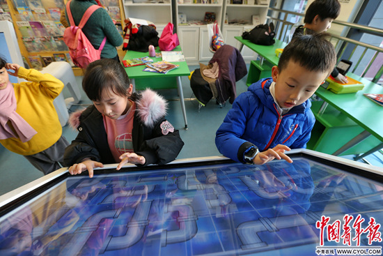 1月10日,北京市通州图书馆,孩子们在大屏幕上做游戏。作为通州区属综合性公共图书馆,通州区图书馆前身可追溯到1916年成立的京兆通县通俗图书馆。随着北京城市副中心的运行,通州区图书馆通过朗读亭、无障碍听书设施、由竹简微缩而成的五河径流图等一系列新设施焕发新生机。