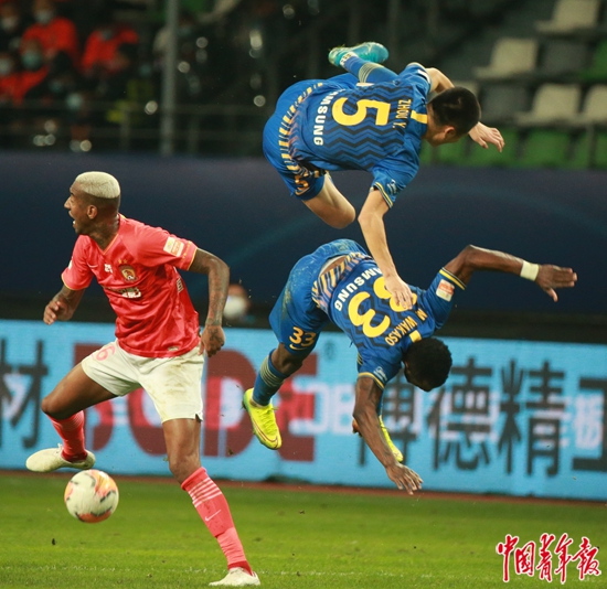 11月12日,江苏苏州奥体中心,2020中超联赛决赛的第二回合的比赛上,双方队员拼争叠罗汉。对阵双方是广州恒大队和江苏苏宁队。