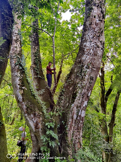 这是一株生长在云南省红河州建水县坡头乡的山核桃树,人爬上它的主干,看上去像松鼠一样渺小。山核桃树正是章为平的研究对象。他发现,这棵树的叶子呈宽倒卵形,而中国有记录的山核桃树叶大多为披针形。章为平作出了最初的判断,这是一个之前在中国没有任何记载的物种——它可能是“体型最大的中国新记录物种”。