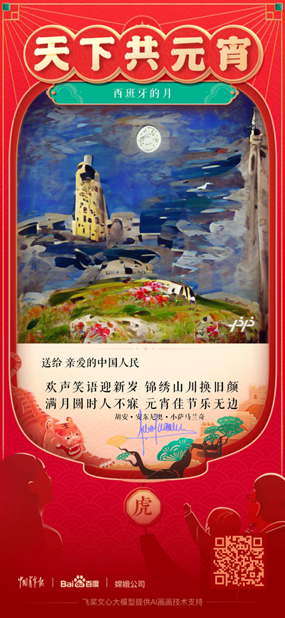 今年元宵节适逢北京举办冬奥会,正在冬奥会闭环内忙碌的国际奥委会北京冬奥会协调委员会主席胡安·安东尼奥·小萨马兰奇,百忙之中也通过“天下共元宵”页面制作了元宵卡,他选择的是“西班牙的月”。AI不但完成了这幅画,还生成一首诗:欢声笑语迎新岁,锦绣山川换旧颜。满月圆时人不寐,元宵佳节乐无边。