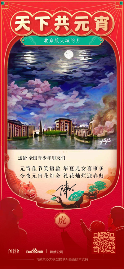 在地球上,曾进入过“天宫”的航天员陈冬在北京航天城绘制了一幅月亮图,他想把“航天城的月”送给全国青少年朋友们——在月圆之夜,航天员用一个简单的举动在青少年中播种飞天梦想。