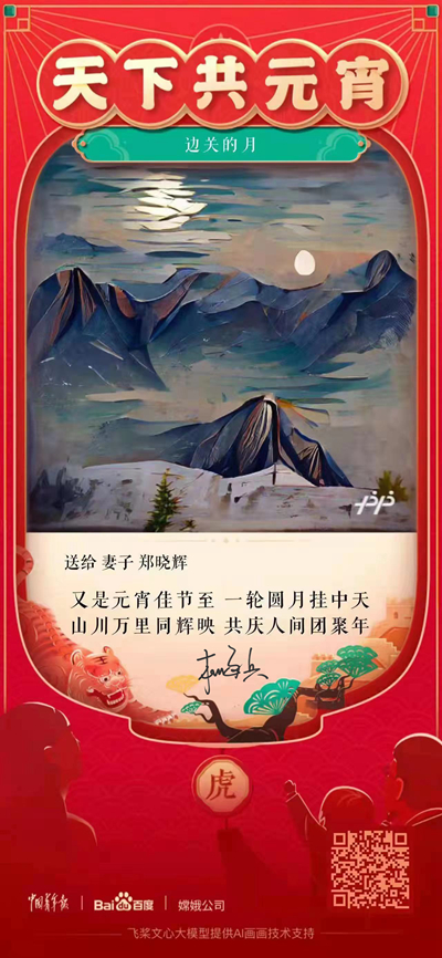 有一张元宵卡,是来自“全军海拔最高哨所的元宵卡”,它寄托着新疆军区和田军分区某边防团河尾滩边防连上士班长杜海兵对远方妻子郑晓辉的思念。12年如一日,杜海兵在海拔5418米的哨所中保卫边疆、守护和平。那里海拔5418米,比珠峰大本营还高出218米,哨所驻地高寒缺氧、四季冰封,强紫外线和宇宙射线照射,因自然环境恶劣被称为“生命禁区”的禁区。今年元宵节,杜海兵特意绘制了这张“边关的月”,连同“山川万里同辉映,共庆人间团聚年”的诗句,送给妻子。