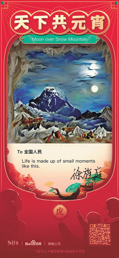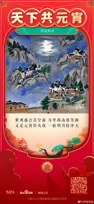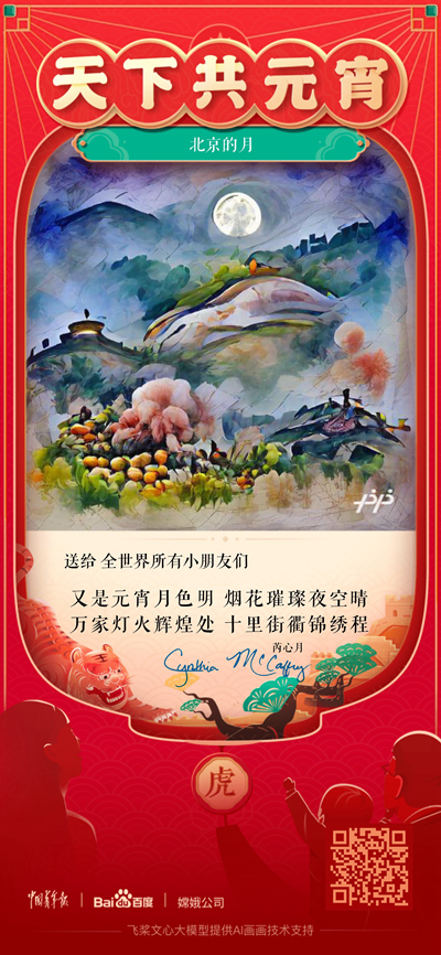 严格意义上来讲,这一幅幅月亮图不是由人类绘制的——参加者只需在“天下共元宵”活动网页中输入想看月亮的地点和要送给的人,AI可以在几秒钟之内完成一幅画作,还可以凭借语言生成能力即兴“赋诗一首”。
