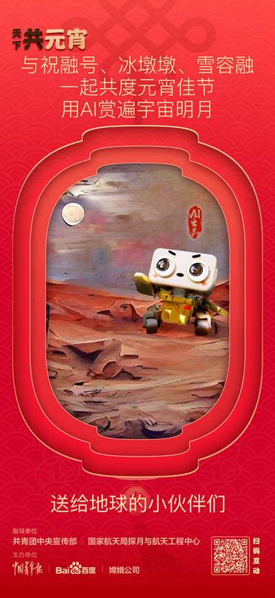 祝融火星车是“天下共元宵”网络公益传播活动的“神秘嘉宾”之一。当日,在共青团中央宣传部、国家航天局探月与航天工程中心指导下,中国青年报社联合百度公司、嫦娥奔月航天科技有限公司、安踏集团发起了这项活动,微博提供传播支持。在“天下共元宵”页面,海内外网友可在AI(人工智能)技术辅助下,一起绘制有关月亮的画作,向亲友送出元宵卡,在网上共度元宵佳节。