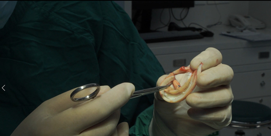 孩子的软骨是粉白色的,看上去非常纯净,郭树忠用手术剪刀轻轻修去上面残留的组织,拿起一份1:1制作的小女孩左耳的透明模版,比对着那段软骨,画下轮廓。