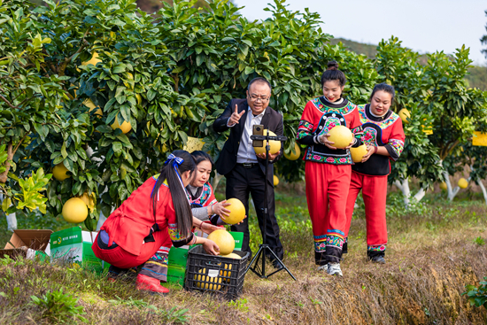湖南省凤凰县菖蒲塘村,菖蒲塘村党委书记、村委会主任周祖辉(中)和村民一起在果园里直播带货,销售当地农副产品。凤凰县供图