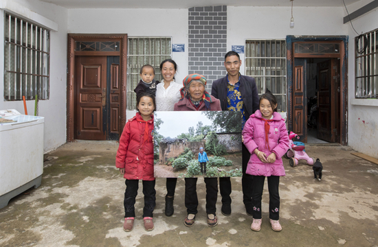 云南省鲁甸县龙树镇照壁村,陈树英一家在自家新房前与老房子的照片合影。老房子年久失修,四处漏雨。如今他们经易地扶贫搬迁安置住进了新房,再也不怕漏雨透风。郑琳东/摄
