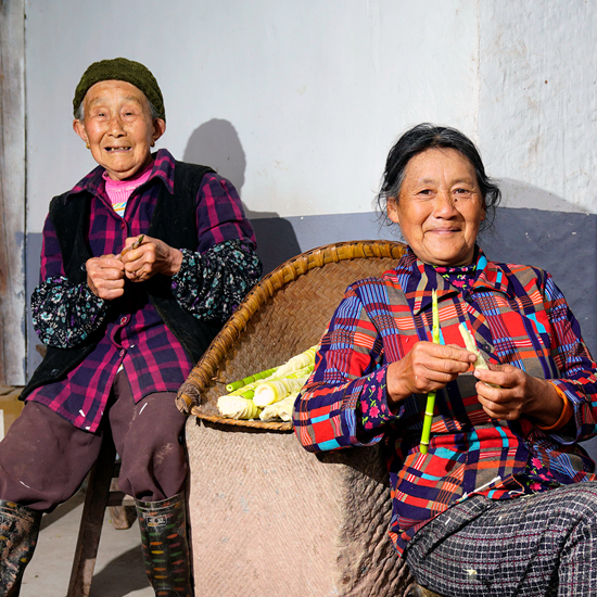 重庆市丰都县三建乡廖家坝,67岁的谭世英(右)和84岁的刘继兰(左)是邻居,她们在一起剥春笋。廖家坝社区以农村人居环境整治工作为突破,全面保障和改善民生。刘嵩/摄
