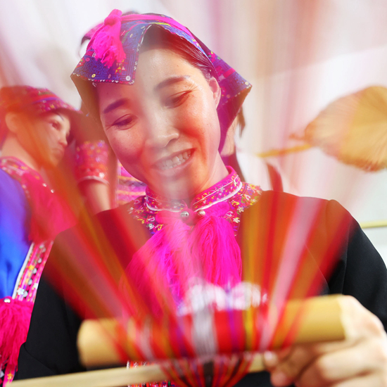 海南省五指山市,一位工匠展示苗族民间刺绣、蜡染传统手工技艺。五指山市供图