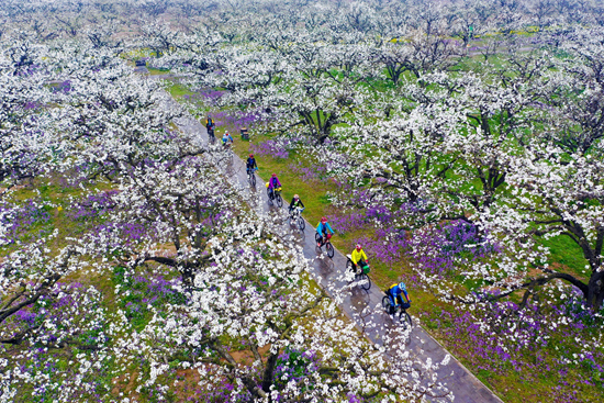 安徽省砀山县,人们在花海中骑行。每年4月初,黄河故道万顷梨园中梨花竞相绽放,吸引了众多游客。近年来,当地积极发展生态休闲旅游,助力乡村振兴。崔猛/摄