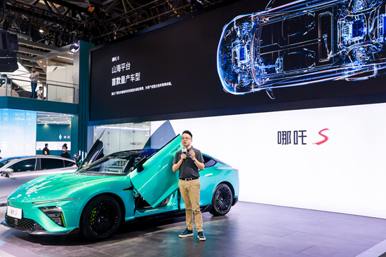日前,哪吒汽车与360针对“10亿股权转让”向记者作出回应,并透露了双方未来的合作计划。图为6月25日重庆车展开幕当天,哪吒汽车副总裁周江向现场观众介绍哪吒S轿跑车。