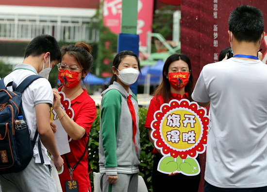 7月11日,在闵行区莘松中学莘沥考点,教师们手持祝福标语与考生们合影留念。