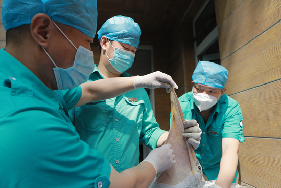 经过第一次手术和护理接触,鹈鹕应激反应大大降低,第二次手术共有9人参与,姜瑞婕缝了168针,用了4个多小时。