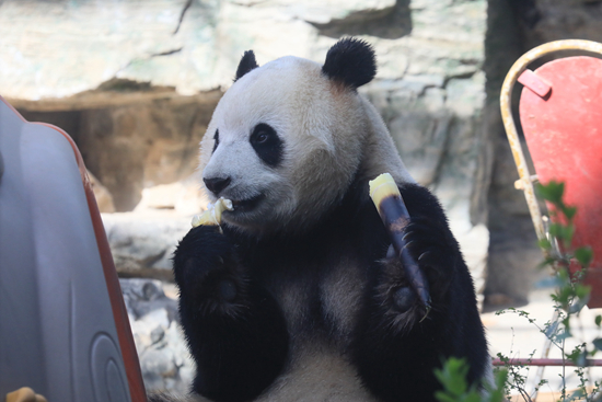 网红大熊猫“福星”在吃竹子。王汉琦/摄