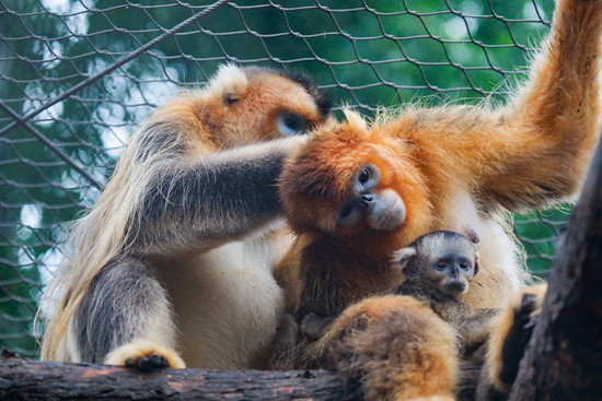 “球球”一家3口刚刚作为今年新生动物的家庭代表之一,出现在许多媒体的新闻画面中。灰色的小金丝猴趴在妈妈怀里,“球球”和“洋洋”毛色金黄,在太阳下闪闪发光。