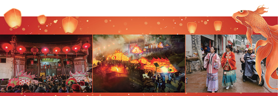 从左到右依次为:正月十六晚,汪满田村祠堂门口挤满了等待嬉鱼灯的人。王磊/摄;汪满田嬉鱼灯场景航拍。 歙县县委宣传部供图;正月十六下午,身穿汉服的女游客走在汪满田村的街头。王磊/摄