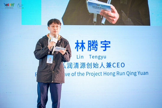 11月3日,大连。在青年创业国际论坛闪电发言环节,弘润清源创始人兼CEO林腾宇介绍自己的创业经历。
