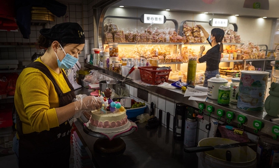早上9点多,周颖将新鲜出炉的面包搬上货架,给面包装袋的间隙,她还得腾出手接听各种订货电话,不大的面包店里,挤满了拎着大包小包的顾客。