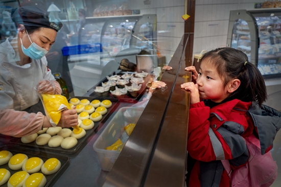 一个小女孩在一家面包店里选购面包。资溪县委宣传部供图