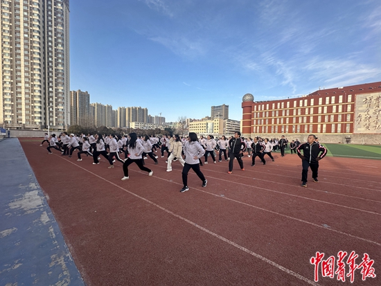 3月8日,晋城一中组织三八妇女节健步走和3.8公里公益跑,张建国与参加活动的教工一起热身。中青报·中青网见习记者 王雪儿/摄