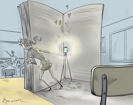 直播行业近年来快速发展,年轻学生积极拥抱“互联网”。可有些学生却走偏了,在教室或寝室不分时段直播,影响他人正常学习生活。还有人打着“学生”名号进行直播、引流带货,甚至为求流量打擦边球直播低俗内容。(《法治日报》5月20日)漫画:徐简