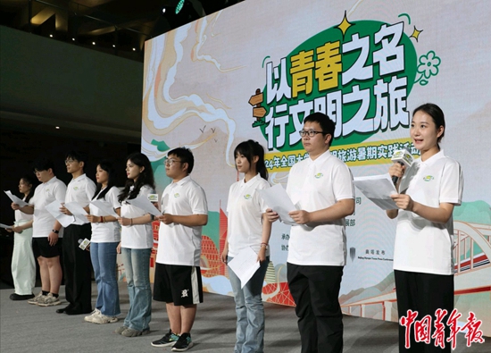 来自北京大学等8所高校的文明旅游宣传实践团队代表,在启动仪式上宣读了“以青春之名 行文明之旅”——大学生文明旅游暑期实践活动倡议书,首批参与暑期实践的8支团队代表接过了活动旗帜,准备在暑期奔赴祖国各地,开展文明旅游宣传实践。