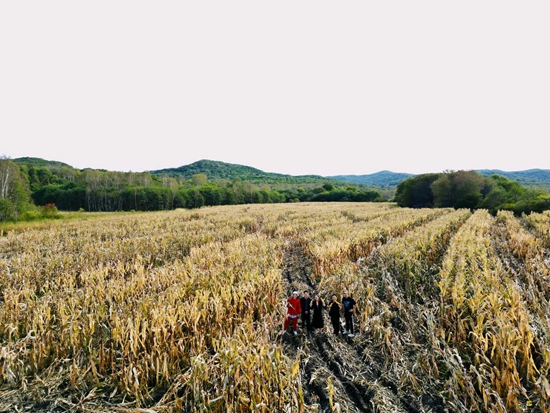 2023年10月初,丁淇和伙伴们在玉米地收玉米。受访者供图