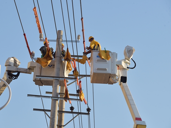 7月21日,湖南娄底,在双峰县永丰街道园艺社区,国网双峰供电分公司带电作业班工作人员身着厚重的屏蔽服在进行高压带电施工作业。视觉中国供图