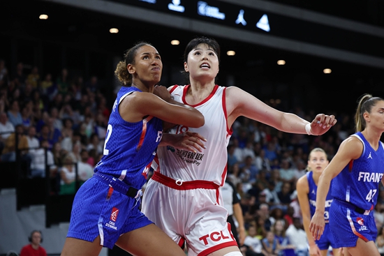 当地时间7月21日,中国女篮在热身赛上负于法国队。图为中国女篮队员李月汝(左二)与法国队员对抗。视觉中国供图