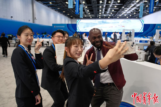 9月2日,北京,位于国家会议中心的2024年中非合作论坛峰会新闻中心,一名来自巴哈马广播公司的记者(右一)与新闻中心综合服务台志愿者自拍留念。据了解,本次峰会期间将有来自20所高校的700名志愿者参与咨询引导、语言翻译等69种岗位服务。