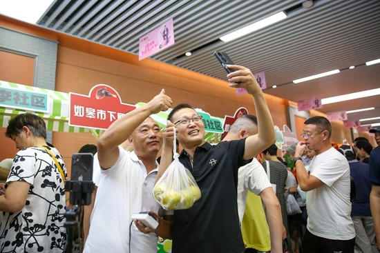 9月1日,在江苏省南通市地铁一号线友谊桥站地下1层大厅里,主播在如皋特色农产品尝鲜会上直播带货并与乘客互动。视觉中国供图