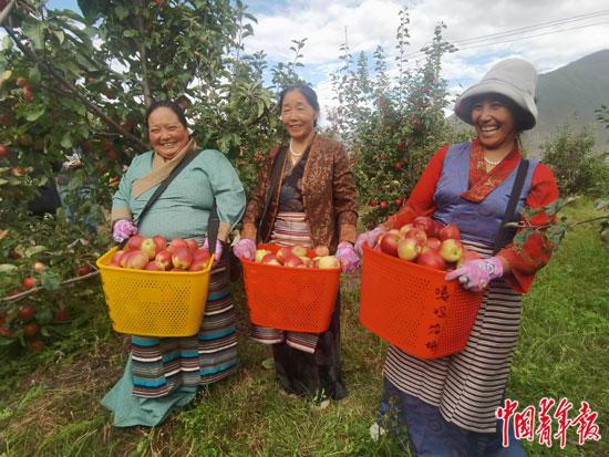 9月2日,西藏自治区林芝农垦嘎玛农业有限公司果园,农场职工正在采收苹果。这里形成以水果种植为主导产业的发展形态,“嘎玛苹果”“嘎玛樱桃”相继获得国家绿色食品A级产品标识认证。
