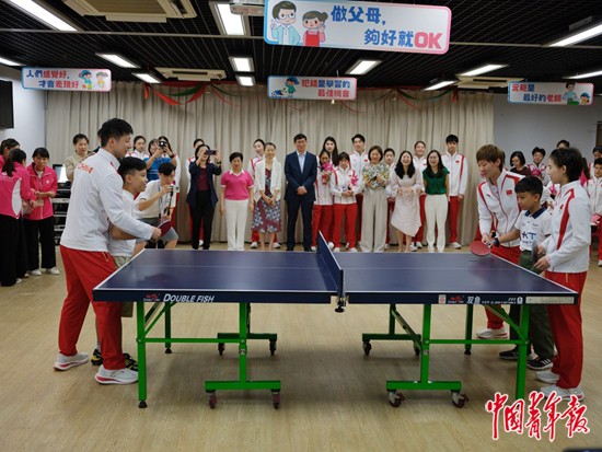 9月2日上午,澳门妇联乐满家庭服务中心,乒乓球运动员马龙、王曼昱和跳水运动员陈芋汐与澳门当地小朋友互动。中青报·中青网记者 李隽辉/摄