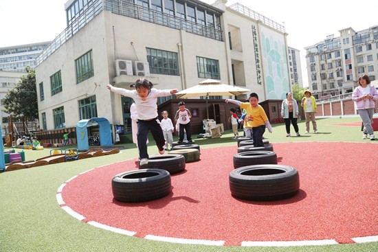 4月25日,江苏省无锡市妇联实验托幼中心的孩子在进行跨越“水沟”体能锻炼。视觉中国供图