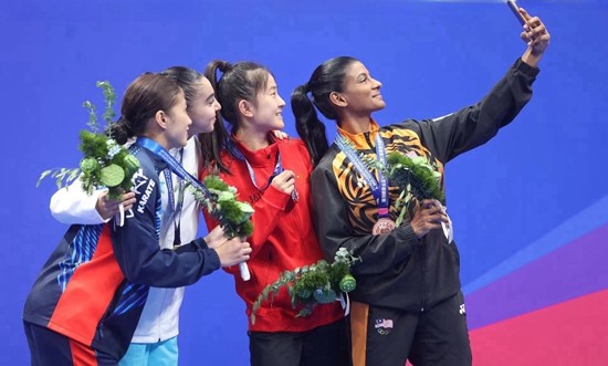 9月22日在浙江省杭州市临平区体育中心闭幕的第20届亚洲空手道锦标赛上,登上领奖台的选手合影,她们在赛场结下友谊。中国空手道协会供图
