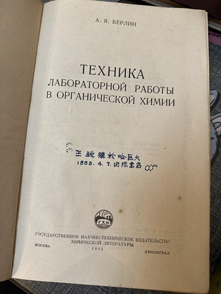 一本俄文书的扉页上有用繁体手写的“王锐购于哈医大,1953.4.7”,左边有几笔烟花涂鸦,右边画了一组化学结构图示。冯源几乎能够想到,25岁的王锐雀跃地用钢笔在一本新书上描画。