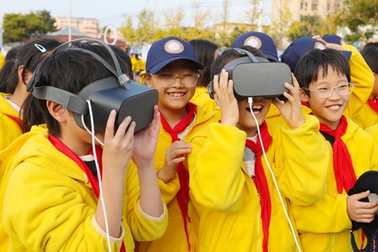 11月11日,安徽省淮北市首府实验小学的小学生体验VR设备。当日,淮北市首府实验小学举行以“科技筑梦 创想未来”为主题的校园科技节。万善朝/摄(新华社发)